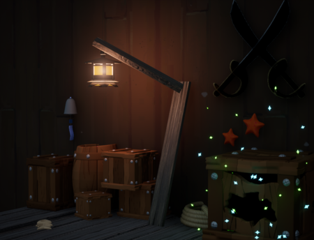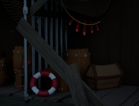 Тонущий корабль заполняют различные предметы, такие как плавательные круги, сундуки, острые мечи, пойманная рыба, которые были созданы, чтобы усилить морскую атмосферу.
