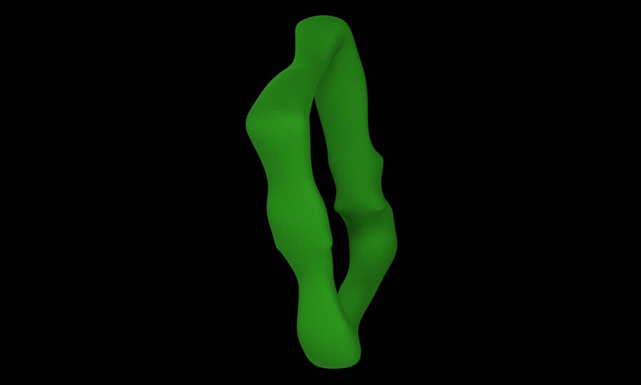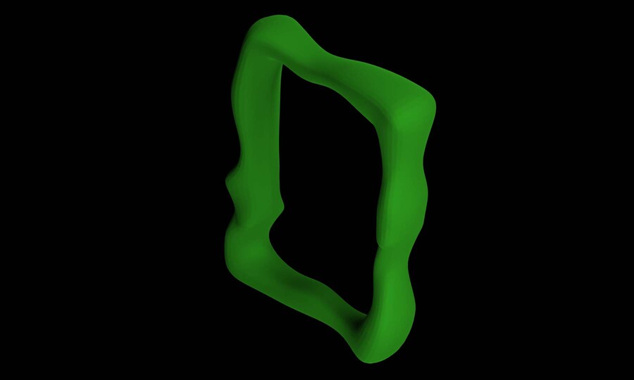 Prompt: an empty vertical rectangular picture frame with slightly rounded corners, frame is made with smooth green plastic, frame has melted look, it is uneven and fluid, frame is modern and simple, background is empty grey, picture frame faces the camera