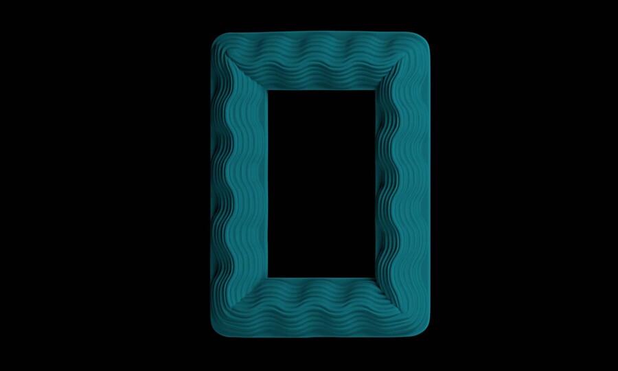 Prompt: an empty wide vertical rectangular picture frame, made with glossy blue plastic, surface of picture frame is covered with layers of medium sized flat waves, empty grey background