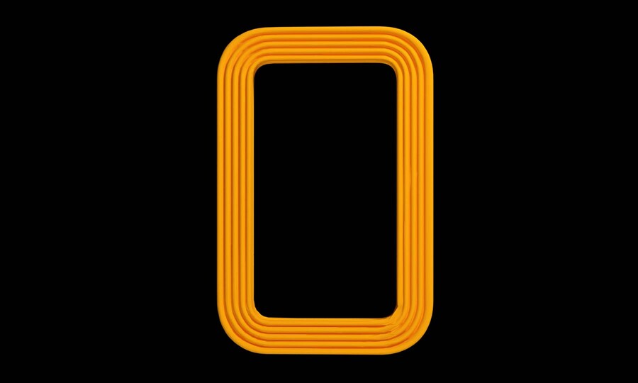 Prompt: an empty vertical rectangular picture frame with rounded corners, frame is made with smooth yellow plastic, frame has rounded geometric pattern on it, frame is modern and simple, background is empty grey, picture frame faces the camera