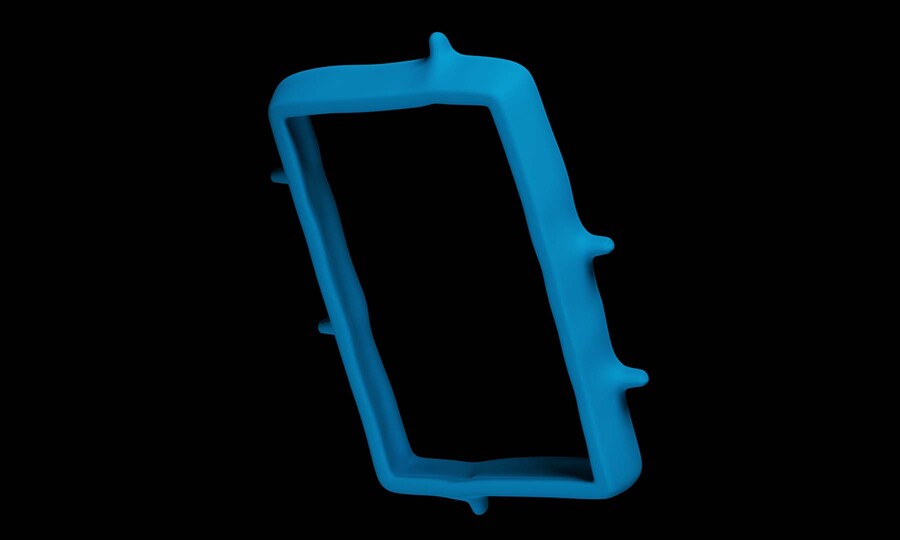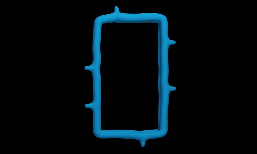 Prompt: an empty vertical rectangular picture frame, frame is made with smooth bright blue plastic, frame has slightly uneven surface with a few spikes, frame is modern and simple, background is empty grey, picture frame faces the camera