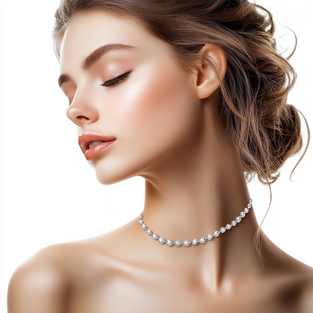 1.girl with diamond necklace on white background 2.girl with diamond earrings and green eyes