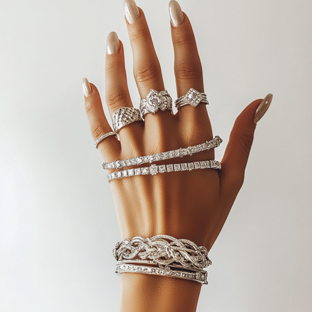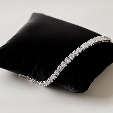 1.tennis bracelet on a black velvet pad on a white background 2.female hand with rings and bracelets on a white background