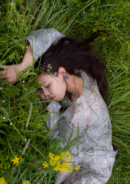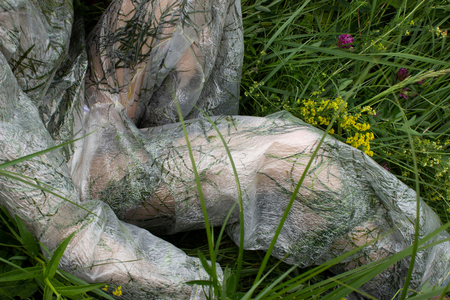 Для создания объектов я использую свежую траву, которую запечатываю между кусками пластика. Из этого материала я шью костюм, покрывающий все тело; он сочетает в себе природное и искусственное, в то время как содержимое между слоями пластика начинает гнить и разлагаться со временем.