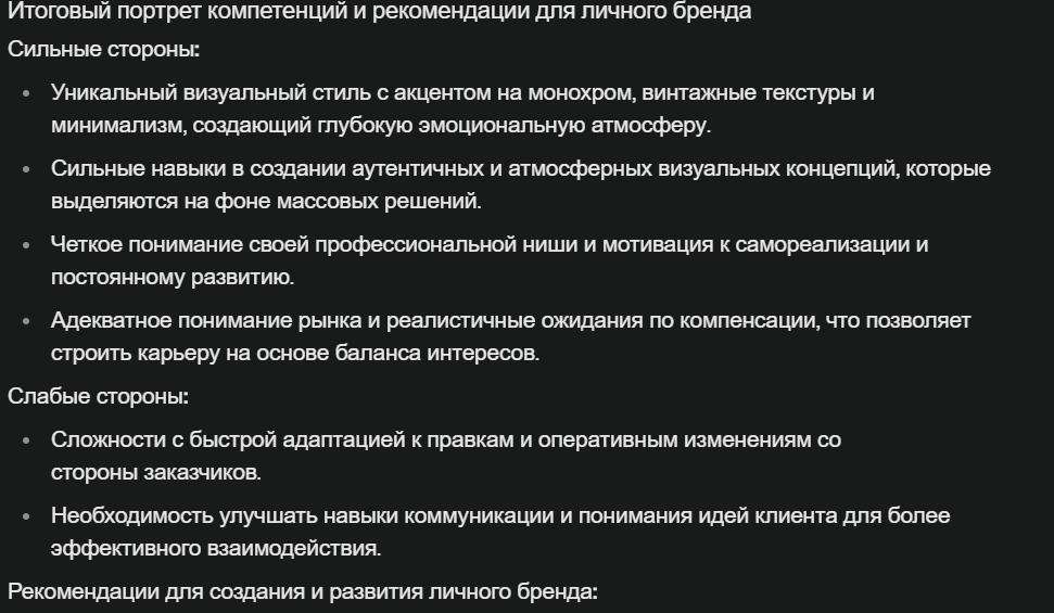 В результате проделанной работы я убедилась, что искусственный интеллект может стать мощным союзником в продвижении персонального визуального бренда — от концепции до аналитики. В основном здесь преимущество нейросетей в сэкономленном времени по части анализа конкурентов и трендов, однако генерировать целый контент все еще кажется сомнительной идеей.