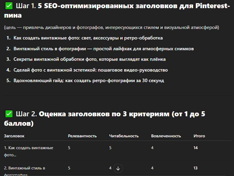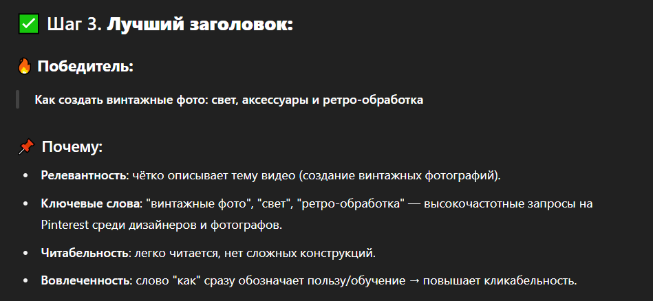 Промпт для ChatGPT: «Ты SEO-эксперт с 5 летним опытом в графическом дизайне. Шаг 1. Сгенерируй 5 SEO-оптимизированных заголовков для пинов для этого видео (до 100 символов с учетом ключевых фраз) Шаг 2. Оцени каждый заголовок по шкале от 1 до 5 по критериям релевантности, читабельности и вовлеченности Шаг 3. Выбери лучший заголовок и кратно обоснуй свой выбор.»