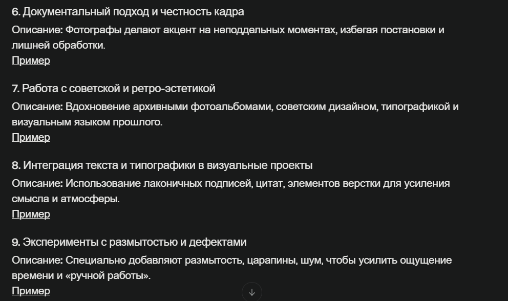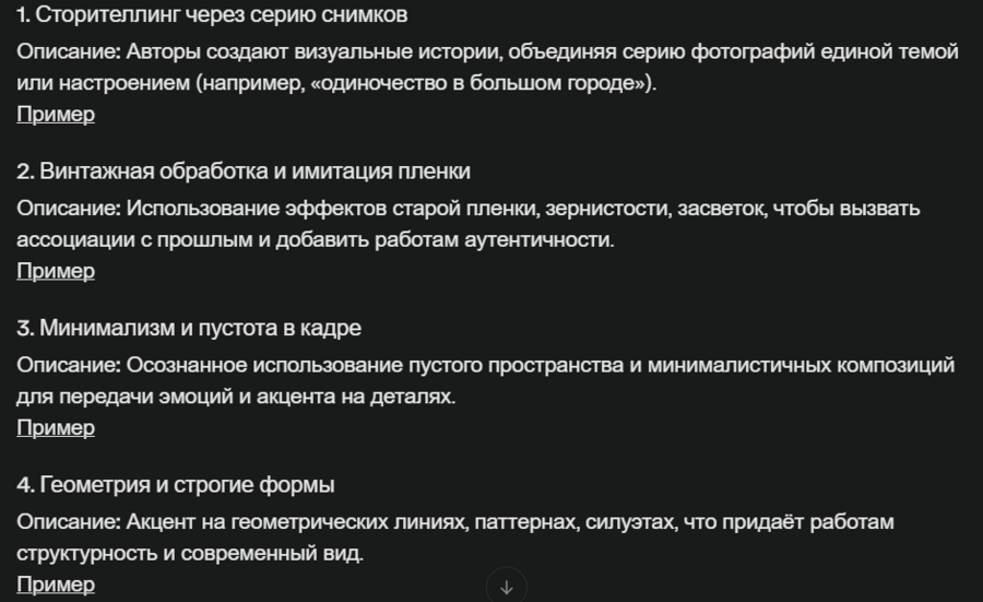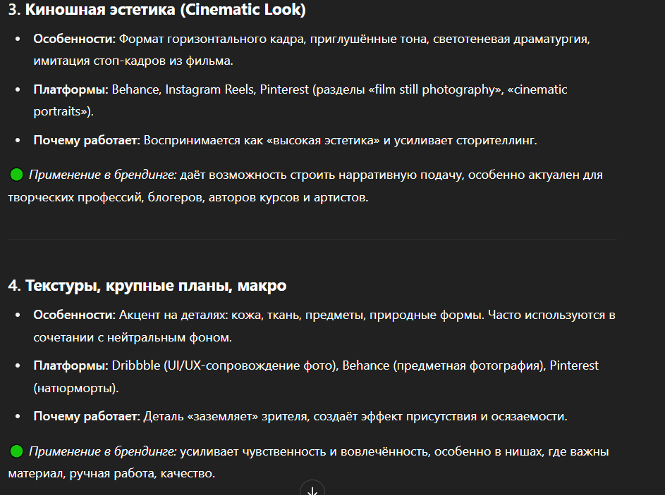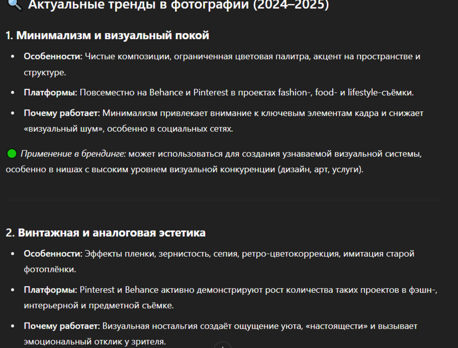 Промпт для ChatGPT: «Проведи аналитический обзор актуальных трендов в сфере фотографии. Удели внимание ключевым стилистическим направлениям, популярным визуальным приемам и востребованным темам. Включи примеры с Pinterest, Behance, Dribbble и других международных арт-платформ. Сопроводи анализ краткими выводами о том, как эти тренды могут быть применимы в продвижении персонального визуального бренда.»
