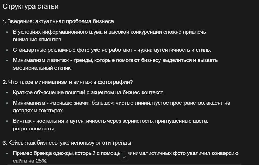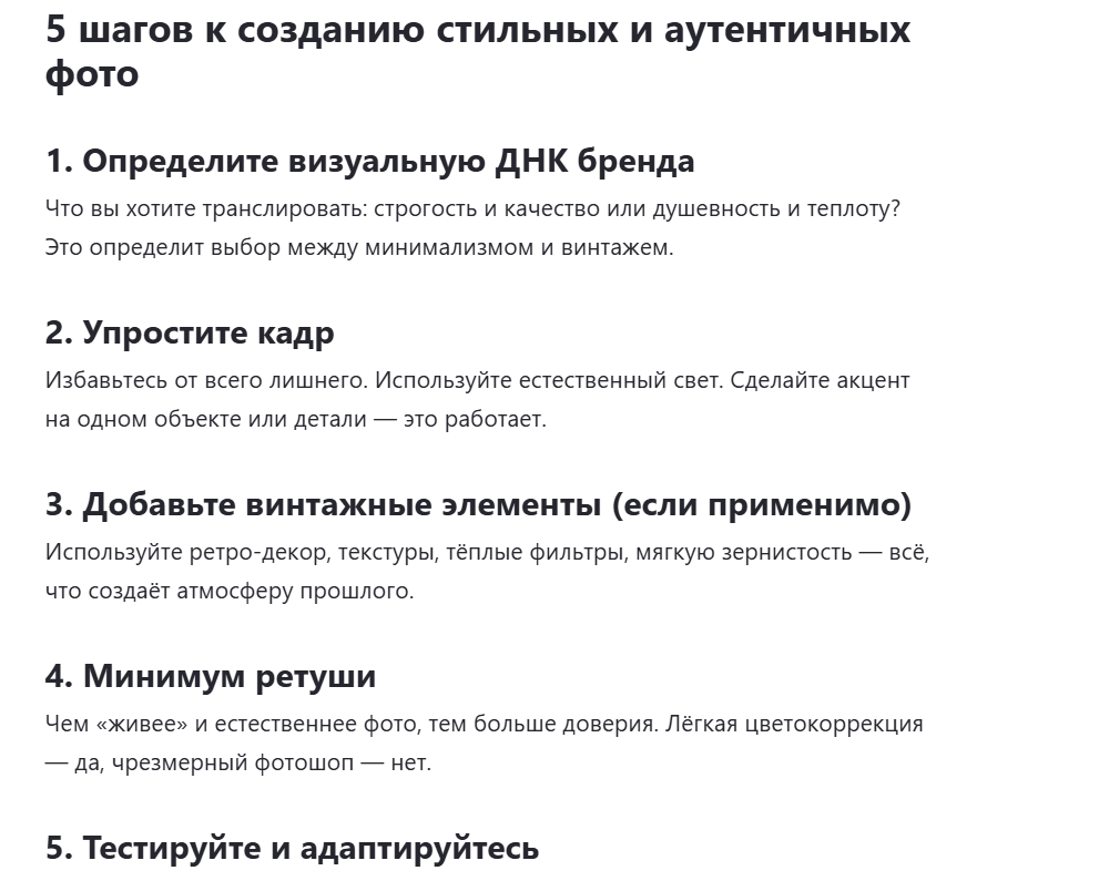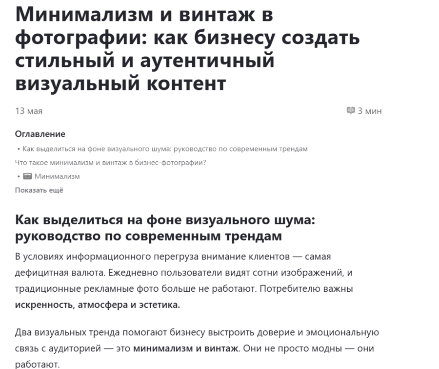 Промпт для perplexity: «Ты — эксперт по созданию контента для платформы Дзен, специализирующийся на привлечении B2B аудитории. Твоя задача — сгенерировать идею статьи на тему Минимализм и винтаж в фотографии: как создать стильные и аутентичные снимки (или ее структуру, или черновик текста) для канала на Дзен, нацеленного на профессионалов и владельцев бизнеса. Контент должен быть создан с учетом следующих ключевых параметров (паттерны от 7 баллов и выше):.......»