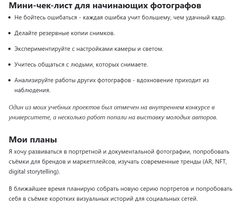 В процессе работы над проектом я значительно развила несколько ключевых навыков. Во-первых, углубилась в работу с ИИ-инструментами: научилась формулировать точные промпты, использовать нейросети не только для генерации текста и изображений, но и как редактора, сценариста и визуального ассистента. Это позволило мне подходить к созданию контента более системно и креативно. Во-вторых, я прокачала навыки SEO и платформенно-ориентированного письма: теперь лучше понимаю, как строить статьи, адаптированные под алгоритмы Dzen и поведение пользователей: как оформлять заголовки, структурировать текст, какие маркеры внимания использовать.
