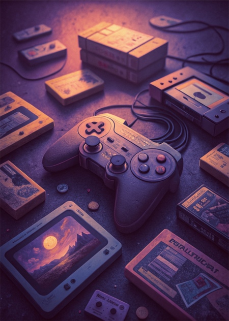 Промпт: A realistic and atmospheric artwork featuring a game controller at the center, surrounded by scattered video game cartridges. The scene is illuminated with a rich color palette of purples, orange, black, and yellow, blending seamlessly with smooth gradients. The lighting creates a moody yet vibrant ambiance, evoking a sense of nostalgia and excitement. The composition highlights the textures of the controller and cartridges, with subtle reflections and soft glows enhancing the futuristic yet retro feel.