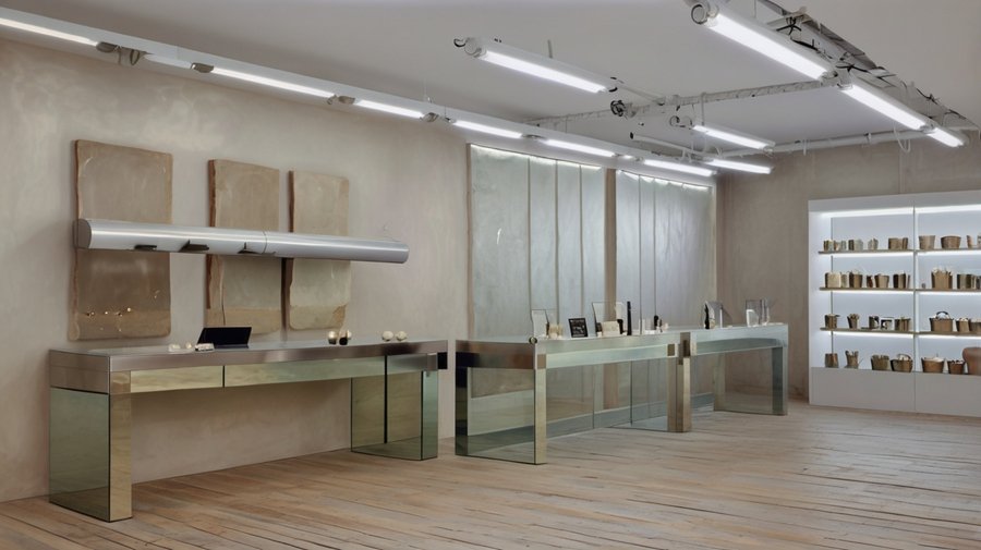 Промт — - please generate an image of a retail space where jewelry will be sold, the design of which is based on the shapes of a ballet barre. . The space itself should consist of wood and metal, in a minimalistic style, and should look like a ballet hall.