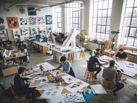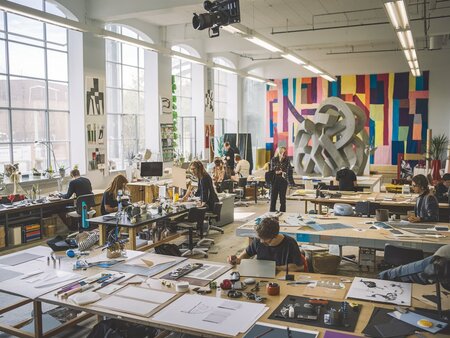 This image shows a brightly lit, spacious creative design studio filled with artists working on various projects. The studio has large windows that allow natural light to flood the space, and the walls are decorated with different multidisciplinary projects. There are multiple workstations with tables covered in design supplies such as drafts, sketches, models of the final product, and other creative tools. Some people are working with design object models, while others are sitting and working on the tables. It is messy in the studio and you could see e lot of stuff designers are working with. On the back of the studio you could see some unfinished avant-garde sculpture. The atmosphere appears lively and collaborative, emphasizing creativity. The image is shot on camera hung on a Ceiling.
