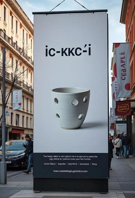A huge promotional banner, for modern design sudio with the inscription «и-кс-и» producing common objects which lost their function featuring a strange object on it, it is [описание обьекта на постере]. With a minimalist design featuring typographic high quality sweden grotesk helvetica like font. The color scheme of the posters is neutral black and white, with dark blue acents on the main words. Banners and posters are located in busy streets.