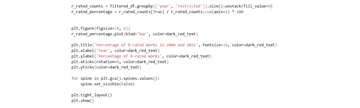 However, the percentage I got from this analysis shows that only about 5% of the works were rated «R,» which includes not only eroticism but also graphic violence and excessive swearing, and the trend has been declining over the years, barely exceeding 1% in 2021.