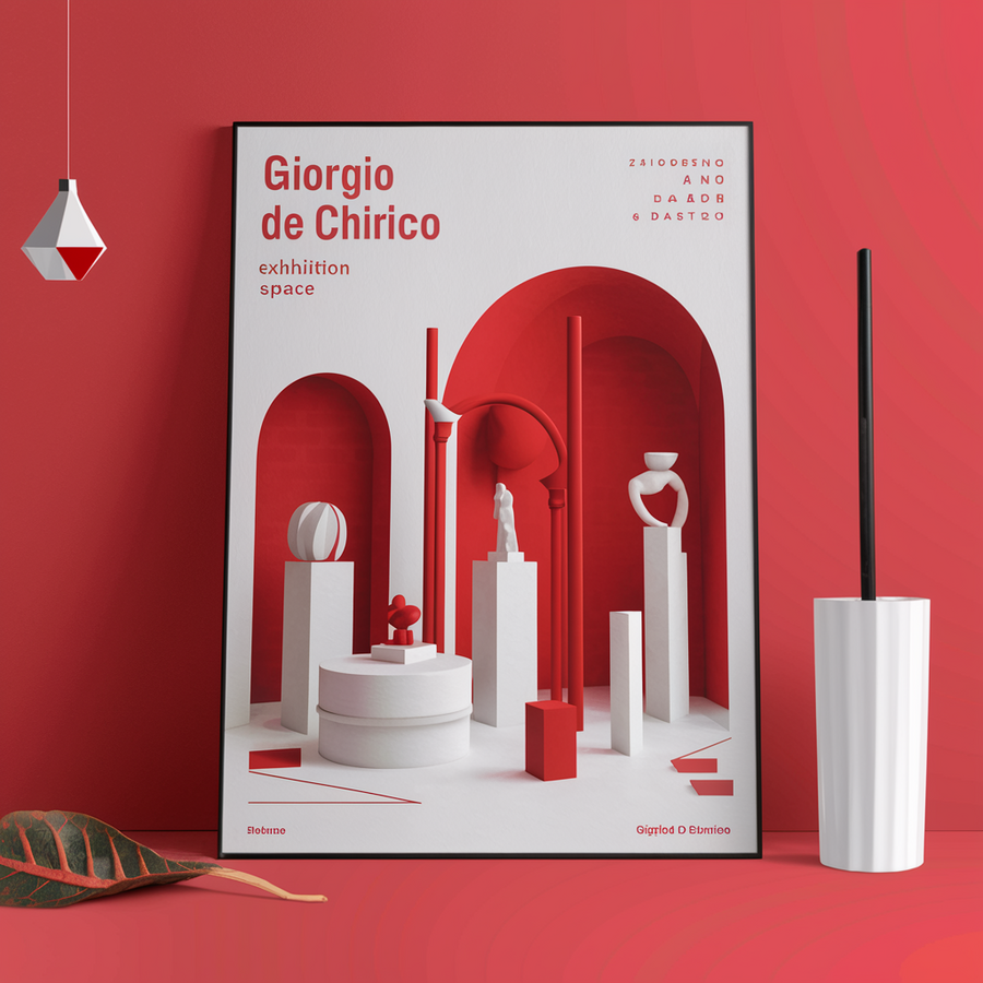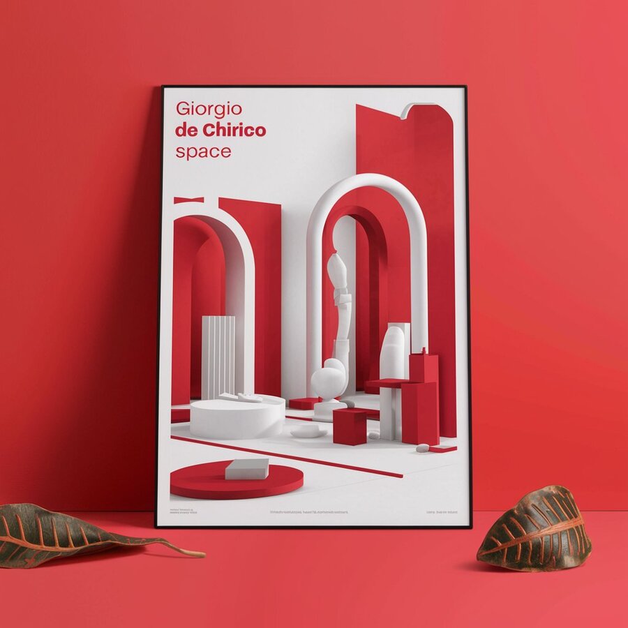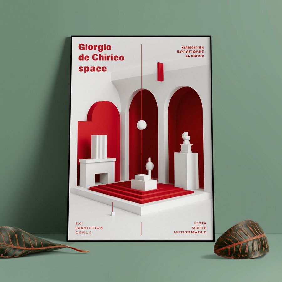 «Create themed posters for the Giorgio de Chirico exhibition space. The poster should look minimalistic and include a 3d rendering of the exhibition space in red and white color with arches, sculptur»