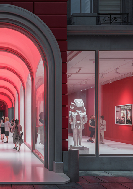 «Generate a 3D rendering of the exhibition space „Giorgio de Chirico“ Common colors are red and white. Show the entrance in the form of an arch with a sculpture on each side»