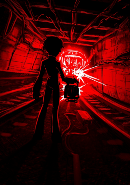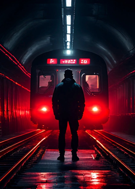 Обложка сгенерирована с помощью Playground по промпту: «1 man, a metro station guard, stands in a dark metro tunnel, stands between two tracks on the rails, stands with his back to the viewer, his face is not visible, a dark male silhouette, a metro train is coming towards the man, red headlights of a metro train, red lighting, colors #800000 #FF0000 #000000»