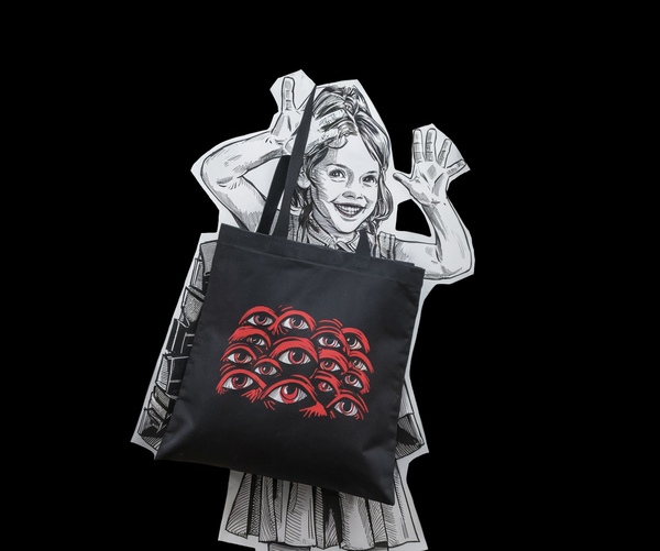 2. «girl, black shopper on her shoulder, red drawing of many eyes on the shopper, arthouse drawing, girl demonstrating merch»