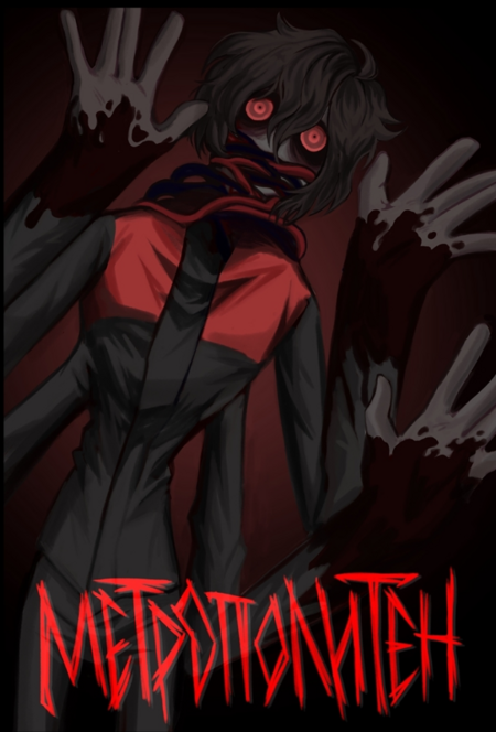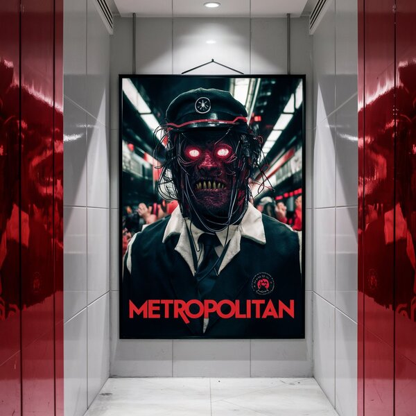 Создано при прмощи ideogram по промпту: «There is a poster hanging on a white wall, merch, the poster depicts a monster in the uniform of a subway worker, the monster’s face is not visible, there are a lot of wires on the monster’s head, only eyes glowing red are visible. there are many hands leaning against the glass, the monster is turned towards the viewer, at the bottom of the poster there is red text „metropolitan“, the poster is made in colors #800000 #FF0000 #000000»