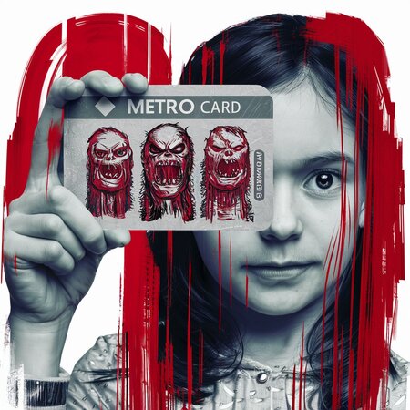 Созданы при прмощи ideogram по промптам: 1. «realistic girl, in her hand there is a metro card, on the fare card there is a red drawing of three horror monsters, an arthouse drawing of monsters, the girl shows the card to the viewer, demonstrates merch»