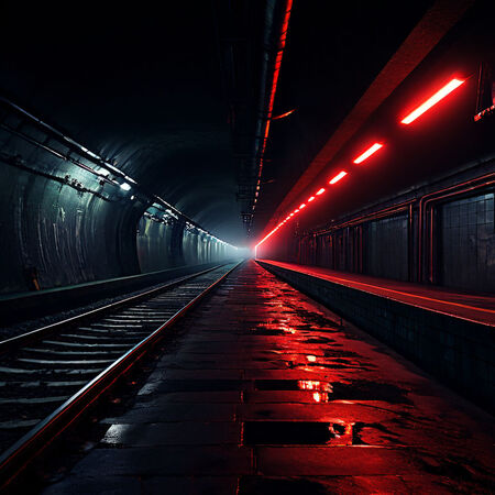 2. «dark subway tunnel, rails, all surroundings in red colors, dark, red lighting, no people.»