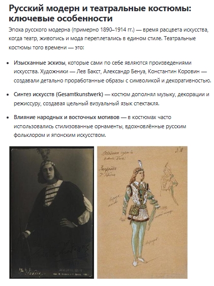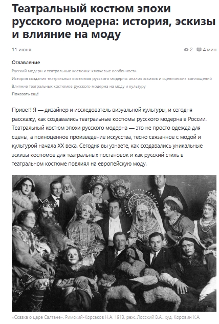 Промпт: «Сгенерируй описание и набор хэштегов для видео о театральных костюмах русского модерна, опубликованного на платформе YouTube Shorts, Дзен и ВКонтакте. Учитывай особенности каждой платформы и используй ключевые слова: [театральный костюм, русский модерн, мода XX века, эскизы костюмов].»