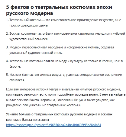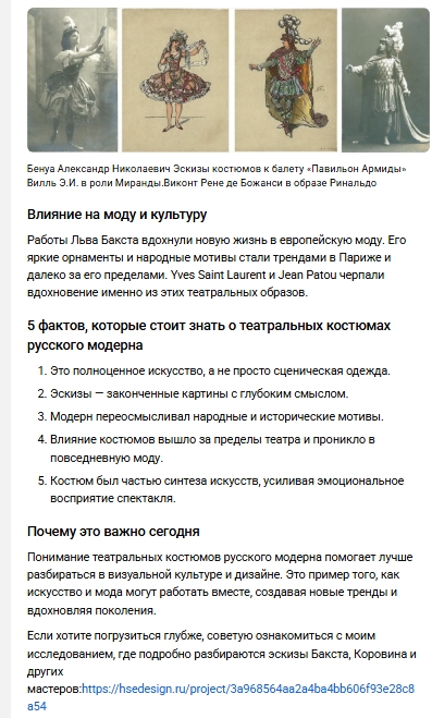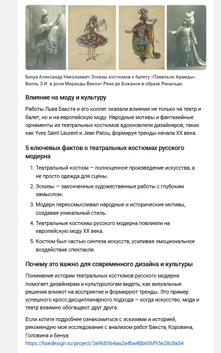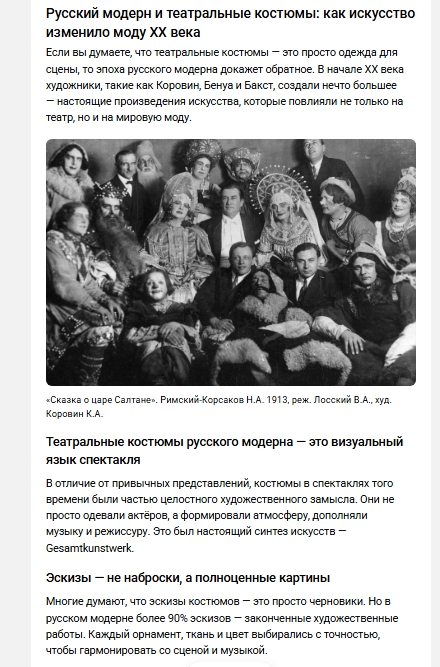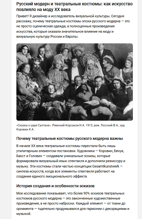 Аудитория лучше реагирует на контент, который показывает связь исторических явлений с современностью. Подчеркивание влияния театральных костюмов на моду XX века и на современных дизайнеров делает тему более актуальной и интересной.