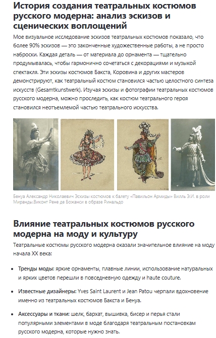 • «Театральный костюм эпохи русского модерна: история, эскизы и влияние на моду.» • «Русский модерн и театральные костюмы: как искусство повлияло на моду XX века.» • «Эскизы театральных костюмов эпохи русского модерна: погружение в мир искусства и моды.» • «Театральные костюмы русского модерна: секреты создания и вдохновение для современных дизайнеров.» • «Русский модерн: как театральные костюмы изменили моду XX века — эскизы, тенденции, влияние.»