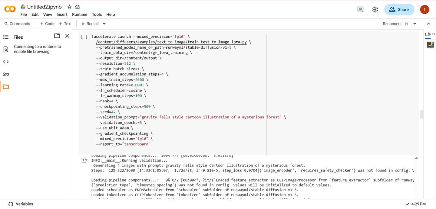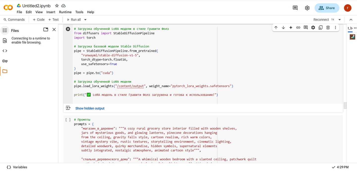 Для создания изображений был использован подход дообучения модели Stable Diffusion с применением метода LoRA. Результатом стала модель gravity_falls_style_LoRA, с помощью которой была сгенерирована итоговая серия.
