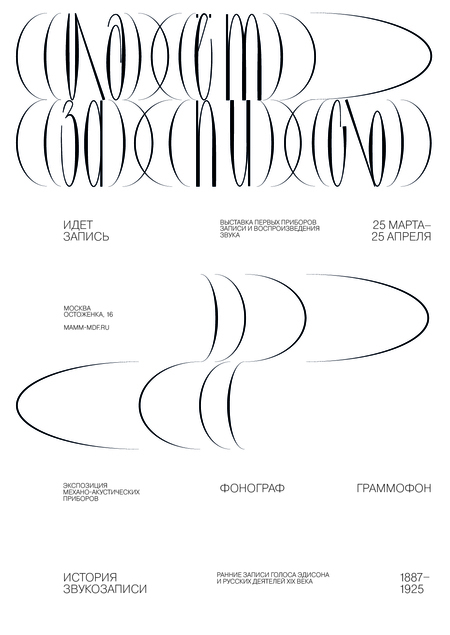 «Идёт запись» — выставка первых приборов записи и воспроизведения звука. Разработанный акцидентный шрифт визуализирует распространение звуковой волны и отсылает к форме первого прибора для записи и воспроизведения звука, фонографу.