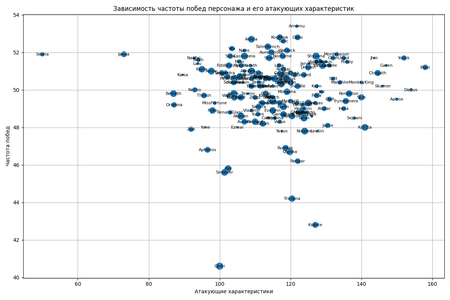 При проверке данной теории мне требовалось отображать статистику по каждому персонажу, чтобы продемонстрировать все краевые кейсы, которые могли бы возникнуть при анализе данных. Для этого мной было принято решение использовать scatterplot из библиотеки seaborn. При этом сама отрисовка каждого графика лежала на библиотеке pyplot, которая является частью matplotlib