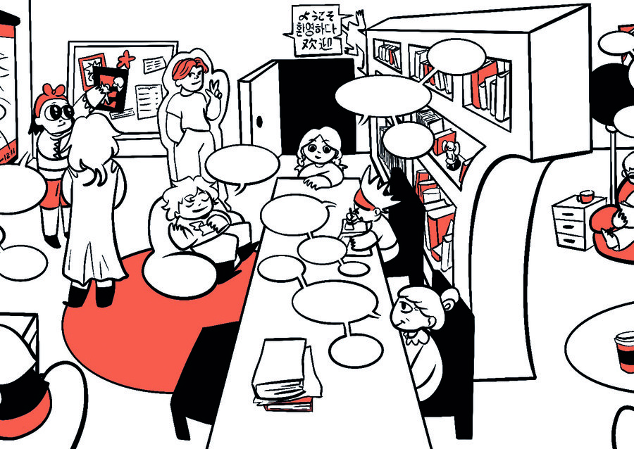 Prompt: A spacious, open-concept room designed for comic lovers, featuring cozy reading corners with plush chairs and bookshelves, a central discussion area with modular seating, and a creative nook with drafting tables and art supplies. One side hosts a large library of comics and a display case for rare items, while the back includes a small stage with a projector for lectures and workshops. The space is bright and inviting, with warm lighting, large windows, and walls adorned with comic art and member creations.