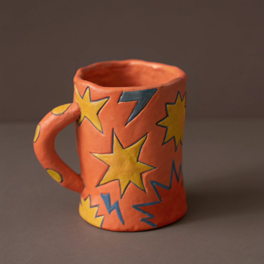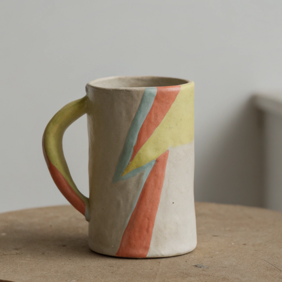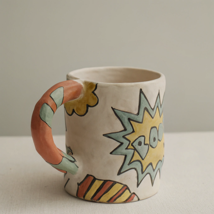 Prompt: A bold and dynamic ceramic mug in orange, yellow, and blue. The design bursts with colorful comic-style artwork, featuring vibrant action lines, abstract shapes, and playful speech bubbles wrapping around the surface. The handle is creatively shaped like a lightning bolt or splash effect, adding energy and excitement.