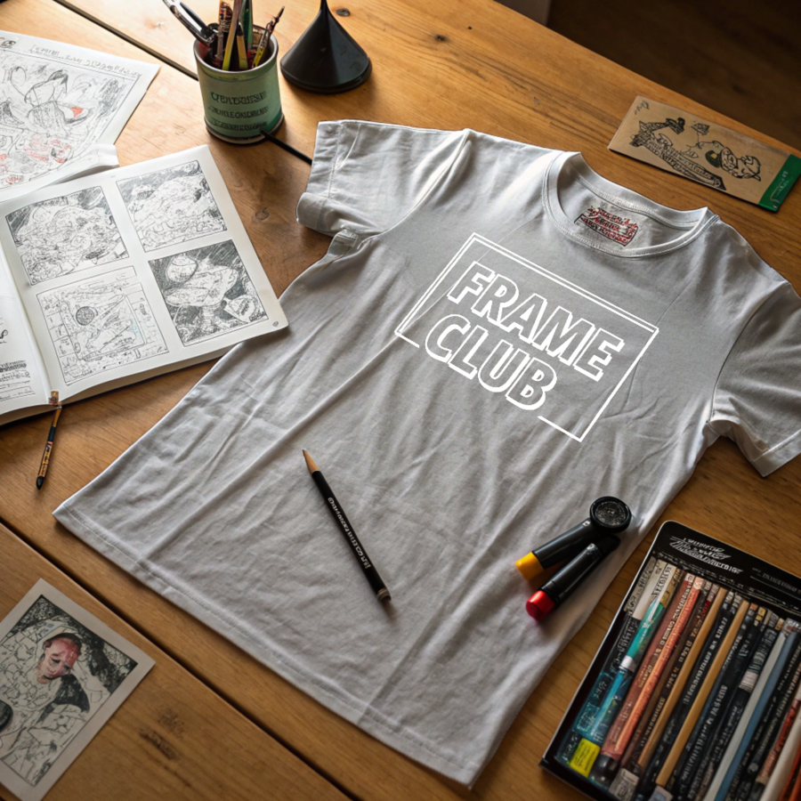2. Prompt: A t-shirt lying flat on a wooden table surrounded by comic sketches, pencils, markers, and inking tools. The setup exudes a creative workspace vibe, with soft lighting highlighting the shirt design and artistic details.