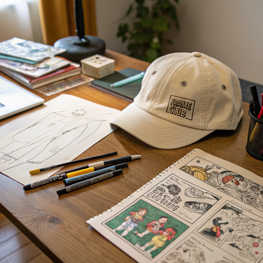 1. Prompt: A hat lying flat on a wooden table surrounded by comic sketches, pencils, markers, and inking tools. The setup exudes a creative workspace vibe, with soft lighting highlighting the shirt design and artistic details.