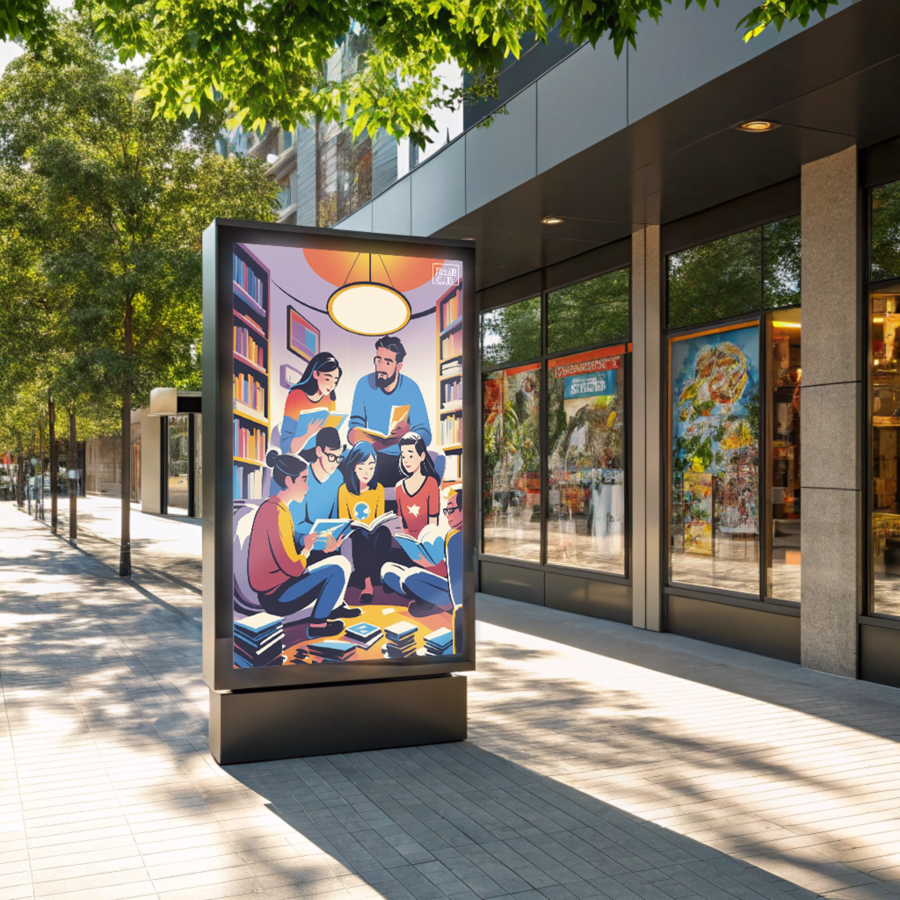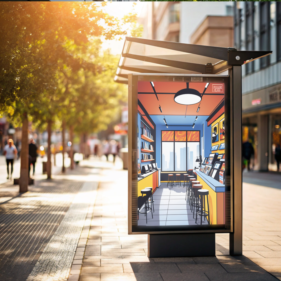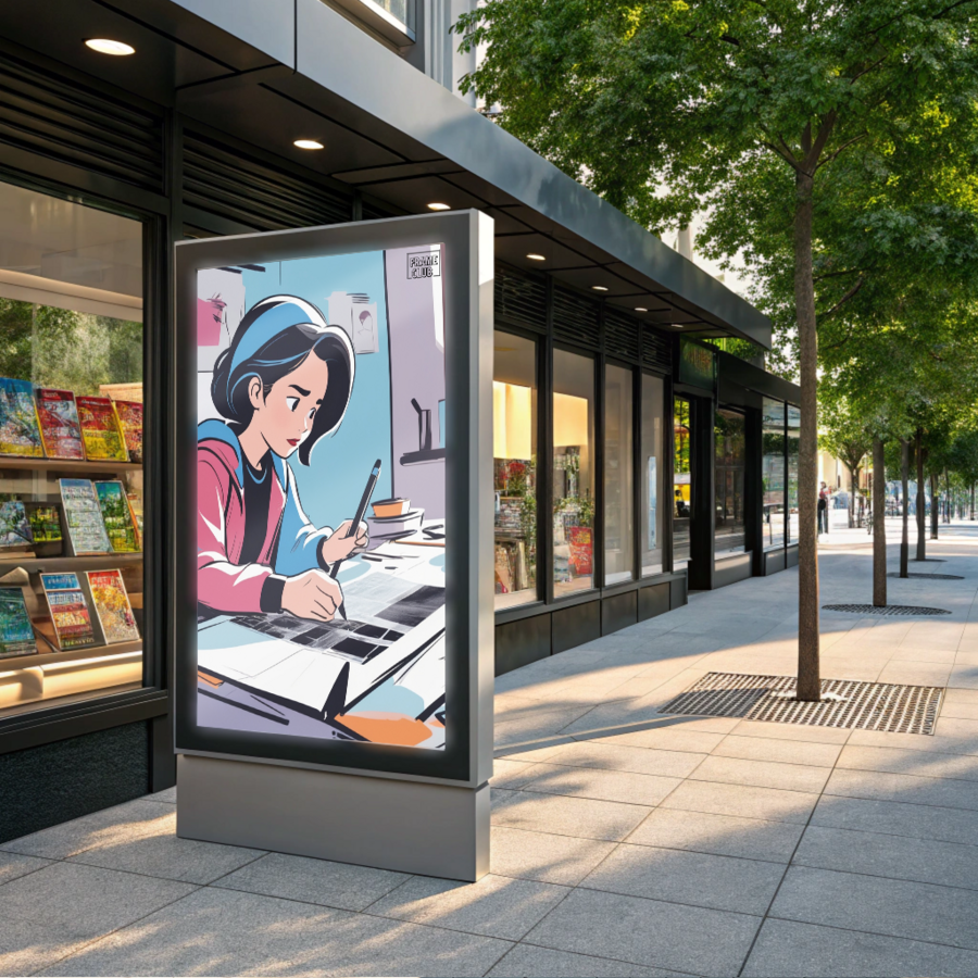 Prompt: A poster mockup near a comic shop, mounted on a modern frame by a sunny sidewalk. The shop’s windows, filled with colorful comics, are visible in the background, while sunlight casts soft shadows from nearby trees.