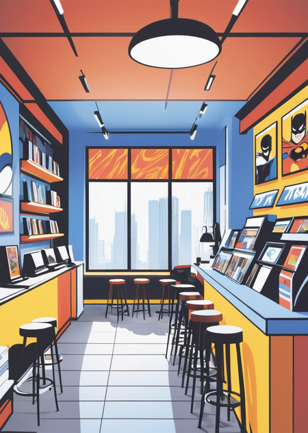 3. Prompt: A vibrant comic book shop with floor-to-ceiling shelves of comics, cozy reading corners, and sleek display racks for new releases and rare editions. A small café counter offers coffee and snacks, with barstools for casual chats. The walls feature iconic comic covers, superhero murals, and rotating local art. Warm lighting and a creative workshop corner make it a hub for fans and creators alike.