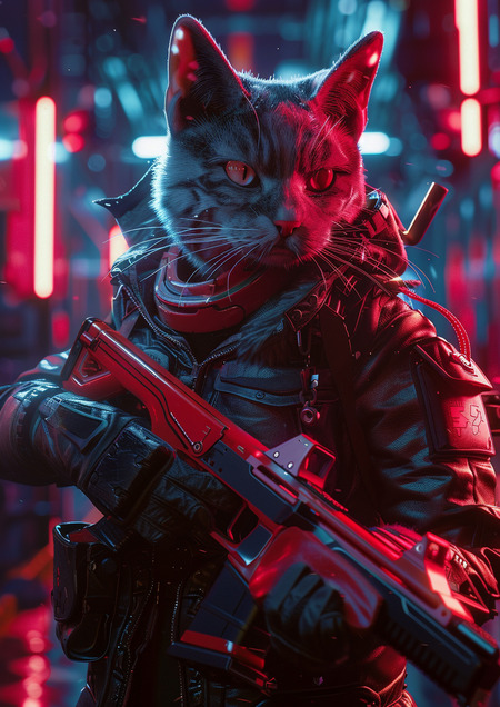 Anthropomorphic cat in the center of the composition in dark combat gear with a red shotgun, in the style of cyberpunk 2077 videogame, dynamic pose, 8K, highly detailed, photorealistic, dramatic atmosphere, octane render, 8 mm, shoot by hasselblad, --ar 124:175 --v 6 --fast