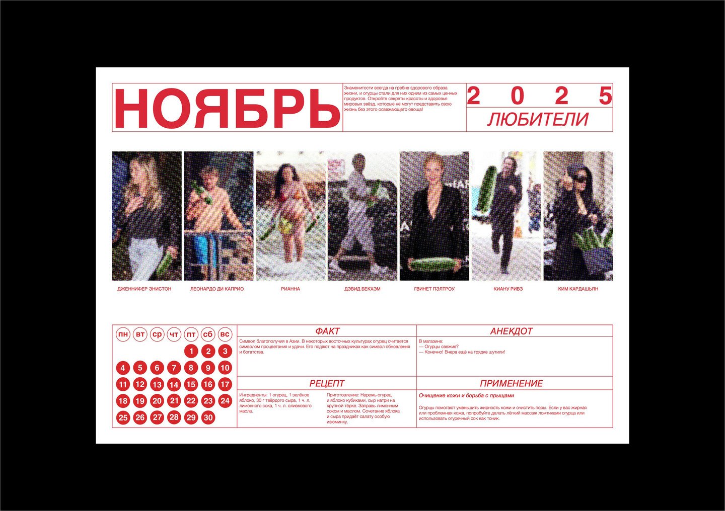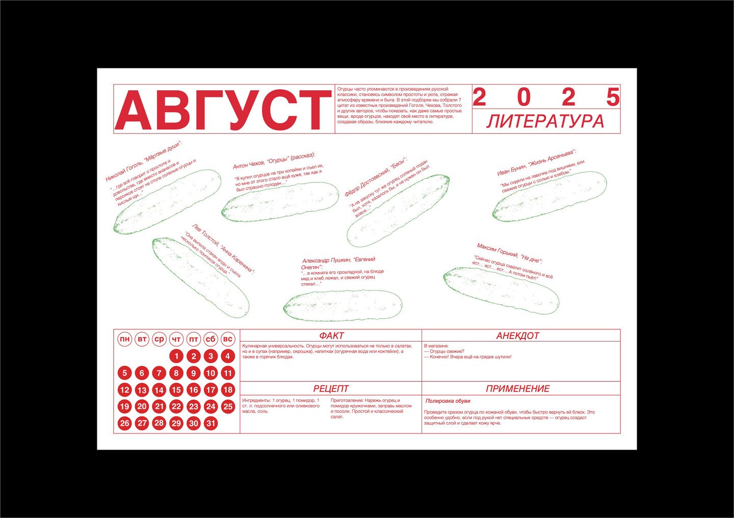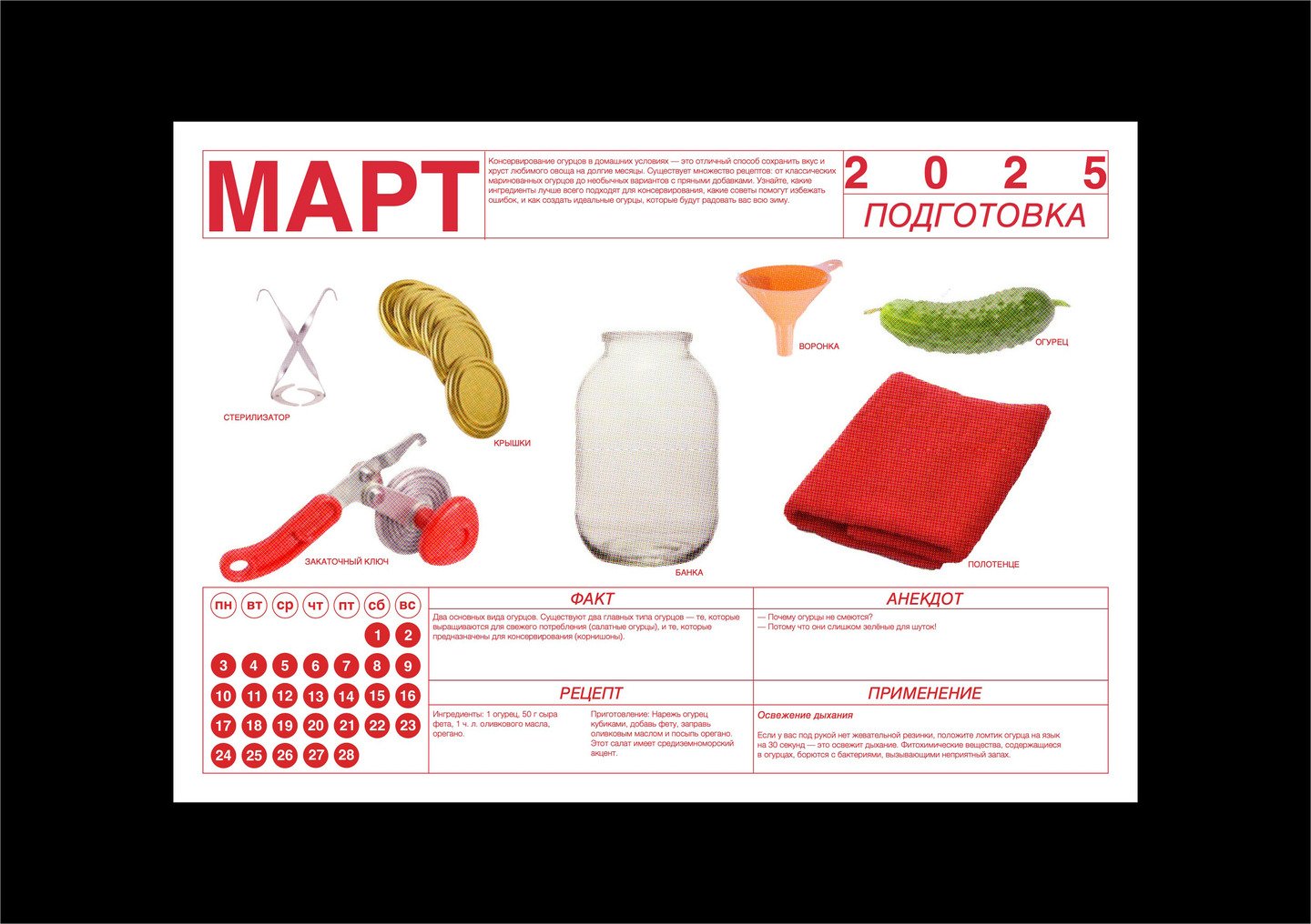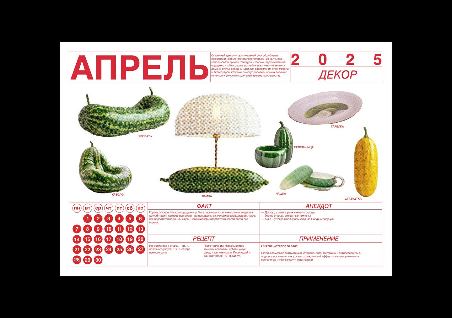 Каждый месяц календаря представляет 7 предметов, идей или историй, связанных с огурцами — от уникальных рецептов до культурных традиций. Это может быть коллекция огуречных фактов, интерпретаций и даже забавных анекдотов, добавляющих интригу каждому месяцу.