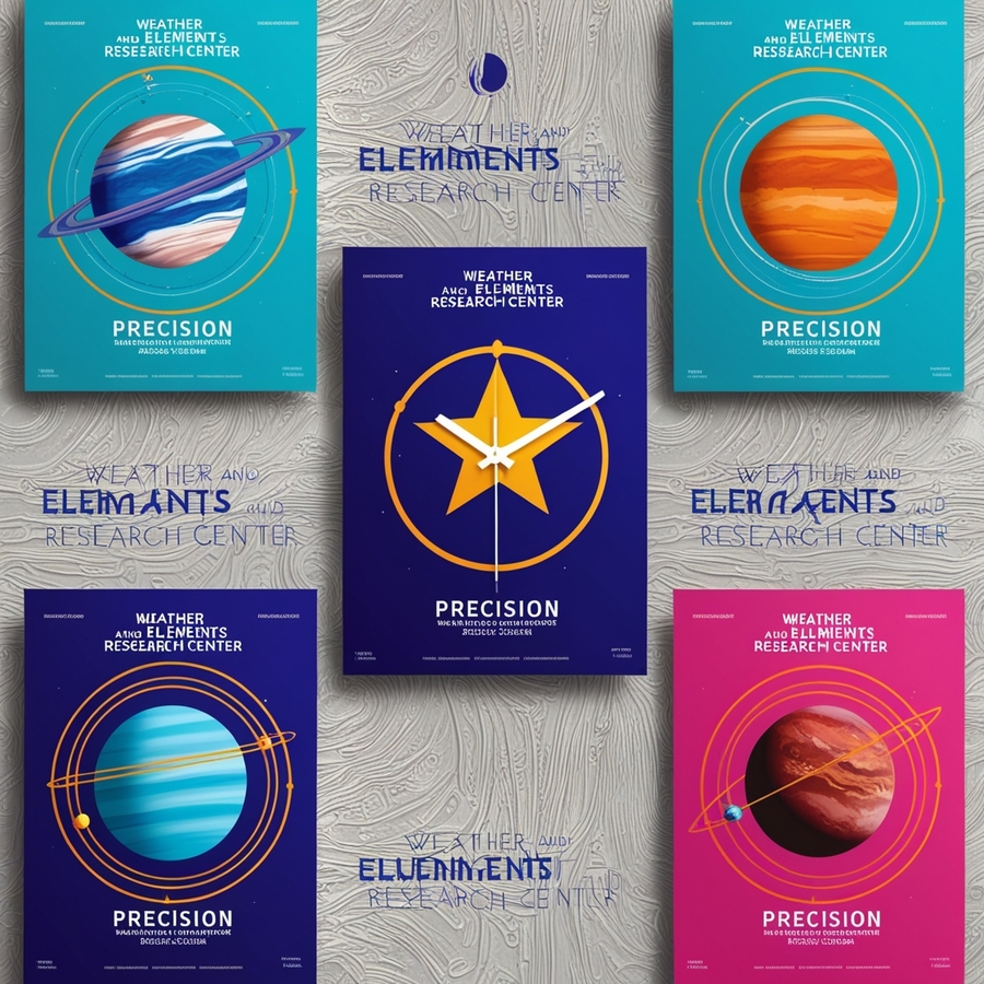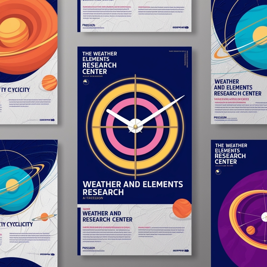 leonardo: A series of advertising posters and posters for the Weather and Elements Research Center, visualizing the metaphor of a clock with a planetary system. The design of the materials includes.