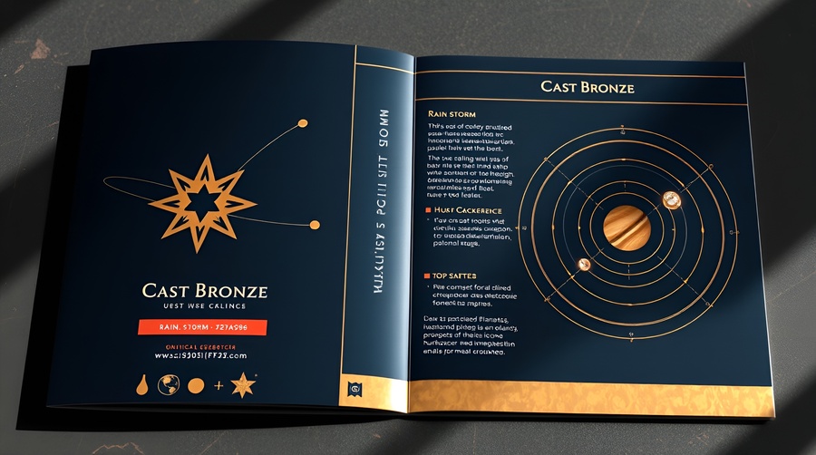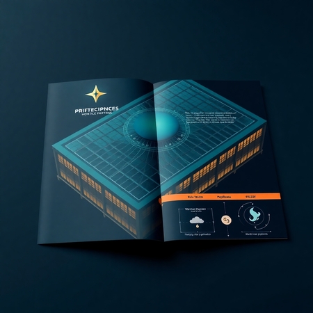leonardo: A sleek and futuristic brochure design inspired by a weather research center’s visual metaphor. The brochure features a modern, clean layout with a dark navy blue background.