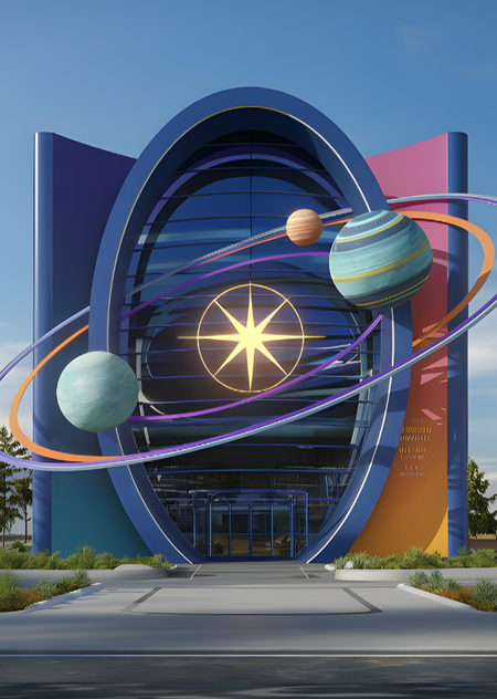 leonardo: A modern futuristic weather and elements research center resembles a clock with a planetary system. Its facade features an orbital structure, with a central bright star symbolizing the core.