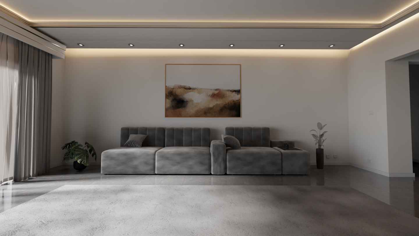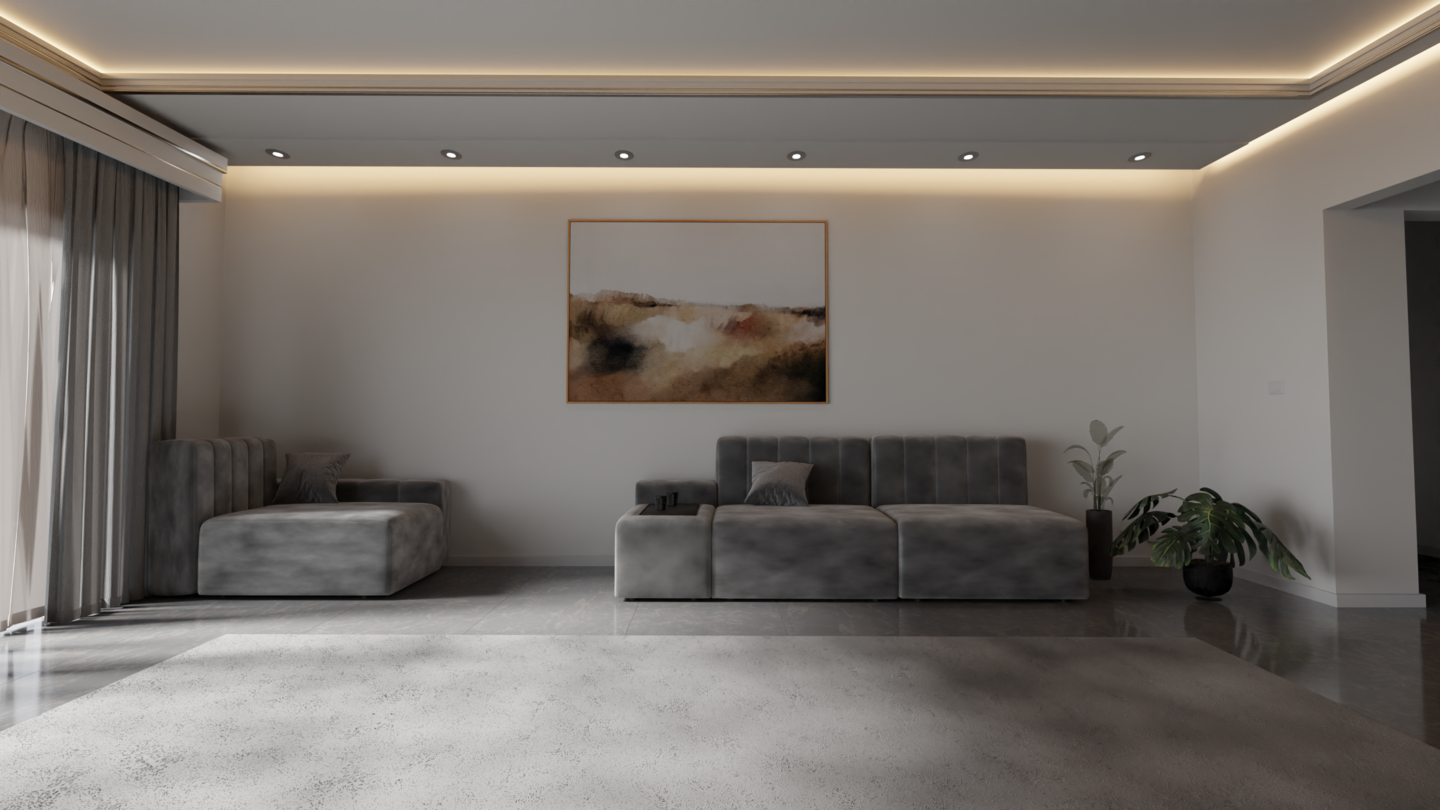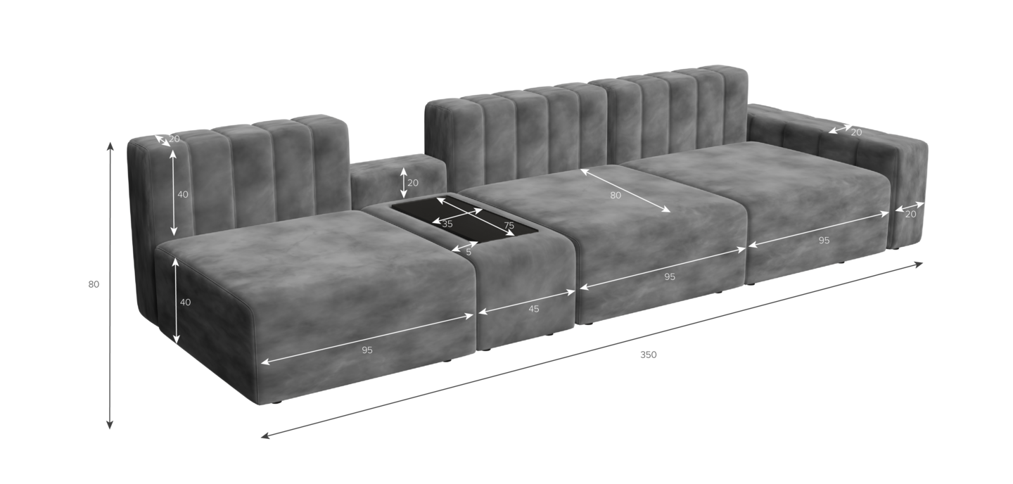 Диванная модульная система «Tris» 2-секционная, встроенный кофейный стол, кресло без подлокотника справа.
