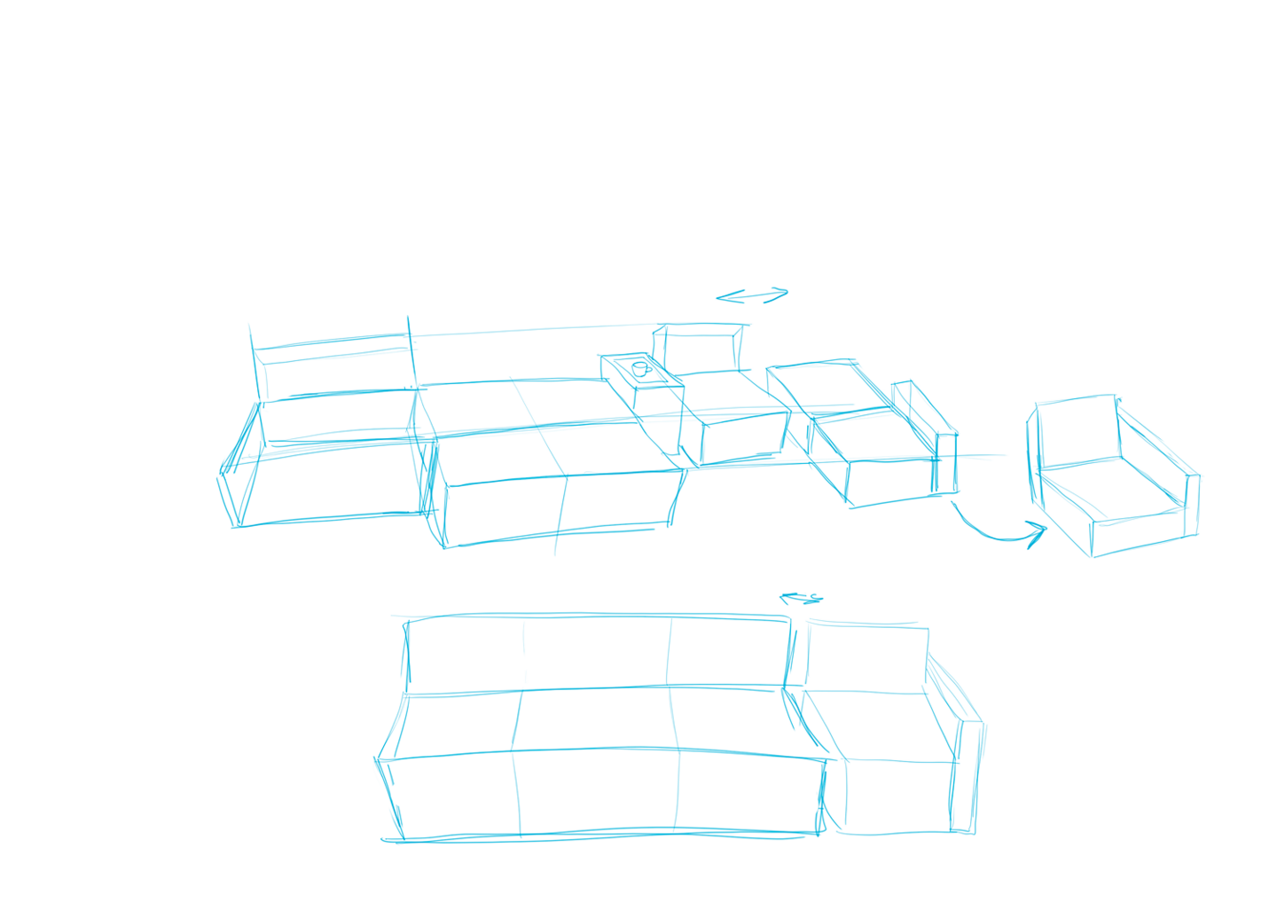 Механизм трансформации каждого модуля — пантограф. Исключением является модуль с встроенным кофейным столиком.