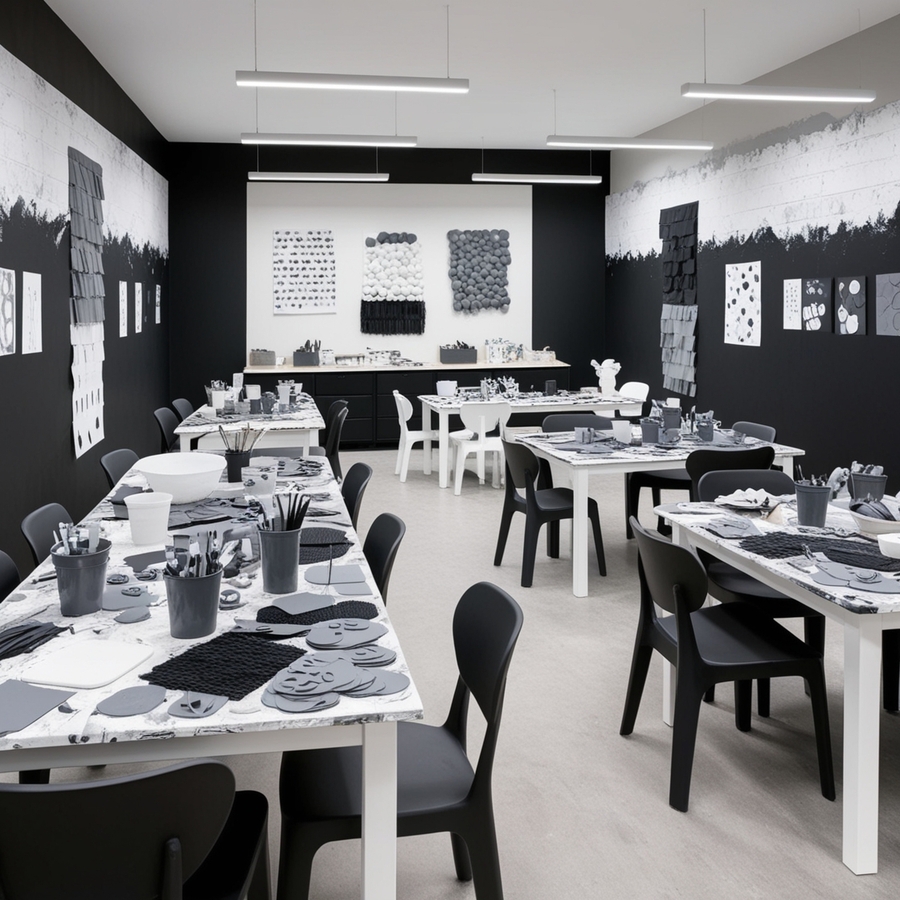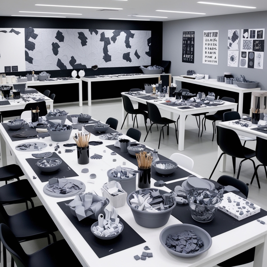 Promt: A workshop space in black, white, and gray, designed for hands-on activities. The room should be filled with worktables covered in various art supplies, craft materials, and unfinished projects, all in shades of gray. The walls should feature unfinished murals and posters, all in a monochrome palette. There should be a mix of seating options, all black, white, or gray. The overall atmosphere should be playful, intentionally messy, and encouraging of creative exploration, even in a state of playful procrastination, all using only shades of gray.