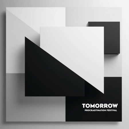 Promt: Design a vibrant poster for the Procrastination Festival «Tomorrow» featuring a bold, geometric composition with three prominent squares, each showcasing a distinct color: a crisp, pristine white, a deep, mysterious black, and a medium gray tone, evoking a sense of balance and neutrality, arranged harmoniously to evoke a sense of modernity and playfulness, with clean lines, sharp edges, and ample negative space to create visual contrast and draw the viewer’s attention to the festival’s name, «Tomorrow», which is displayed prominently in a bold, sans-serif font with a subtle gradient effect to give it a sense of depth and dimensionality. The poster must be strictly monochrome.