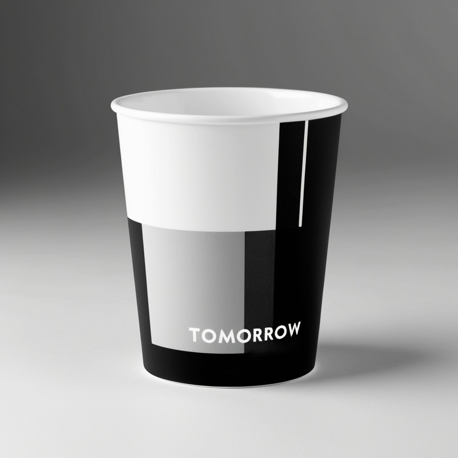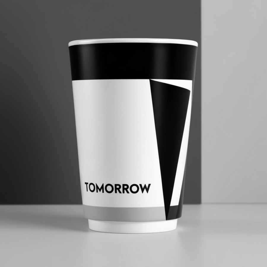 Promt: Design a white cup with an image featuring a bold, geometric composition with three prominent squares, each showcasing a distinct color: a crisp, pristine white, a deep, mysterious black, and a medium gray tone, evoking a sense of balance and neutrality, arranged harmoniously to evoke a sense of modernity and playfulness, with clean lines, sharp edges, and ample negative space to create visual contrast and draw the viewer’s attention to the festival’s name, «Tomorrow», which is displayed prominently in a bold, sans-serif font with a subtle gradient effect to give it a sense of depth and dimensionality. The image must be strictly monochrome.
