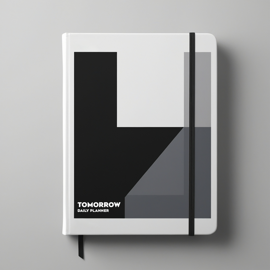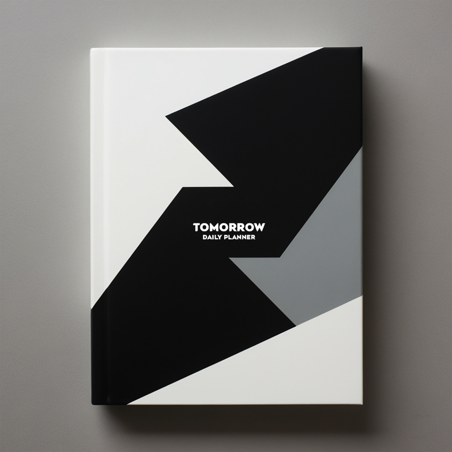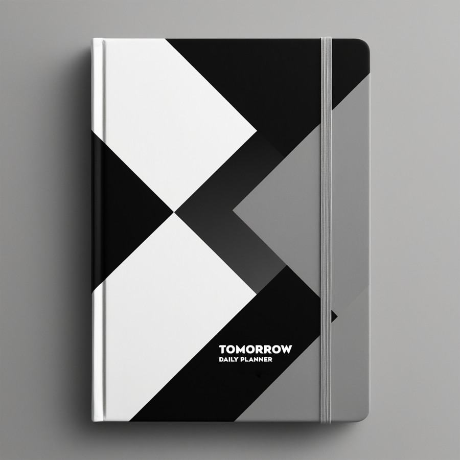 Promt: Design a daily planner with a cover featuring a bold, geometric composition with three prominent squares, each showcasing a distinct color: a crisp, pristine white, a deep, mysterious black, and a medium gray tone, evoking a sense of balance and neutrality, arranged harmoniously to evoke a sense of modernity and playfulness, with clean lines, sharp edges, and ample negative space to create visual contrast and draw the viewer’s attention to the festival’s name, «Tomorrow», which is displayed prominently in a bold, sans-serif font with a subtle gradient effect to give it a sense of depth and dimensionality. The cover must be strictly monochrome.