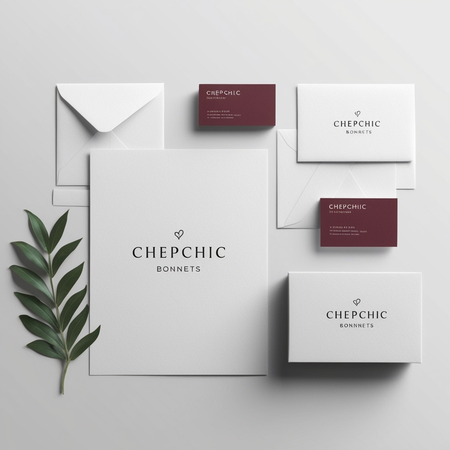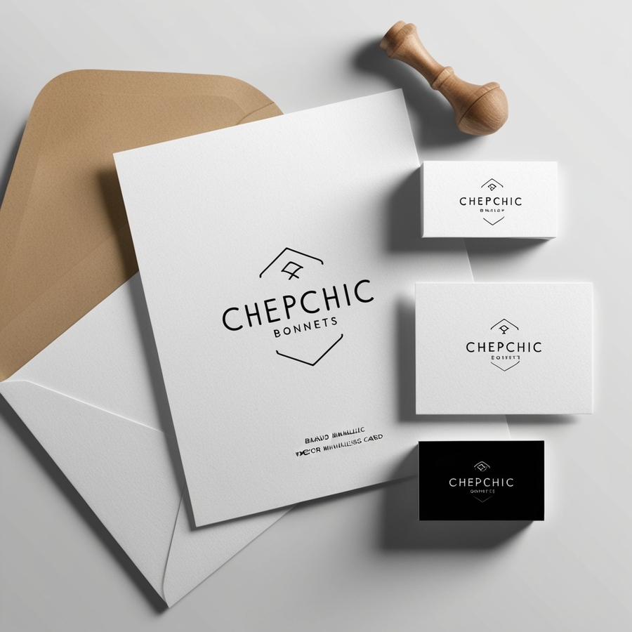 3 и 4. generate of the mockup of printed materials (paper, envelope, business cards) on a white background for the Chepchic bonnets brand vector minimalistic logo, the logo should only have a beautiful font with the brand name Chepchic, the font should have a minimum number of openwork and thin lines, without a lot of details, the font should be in a serif with beautiful graceful corners