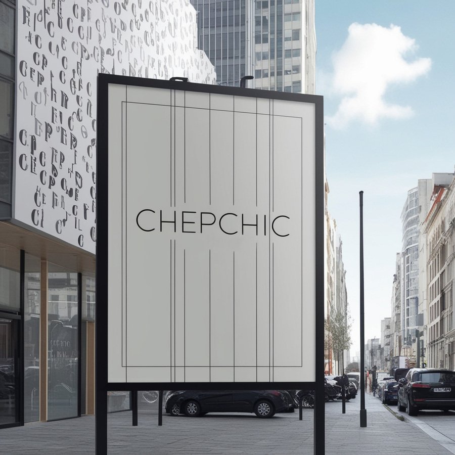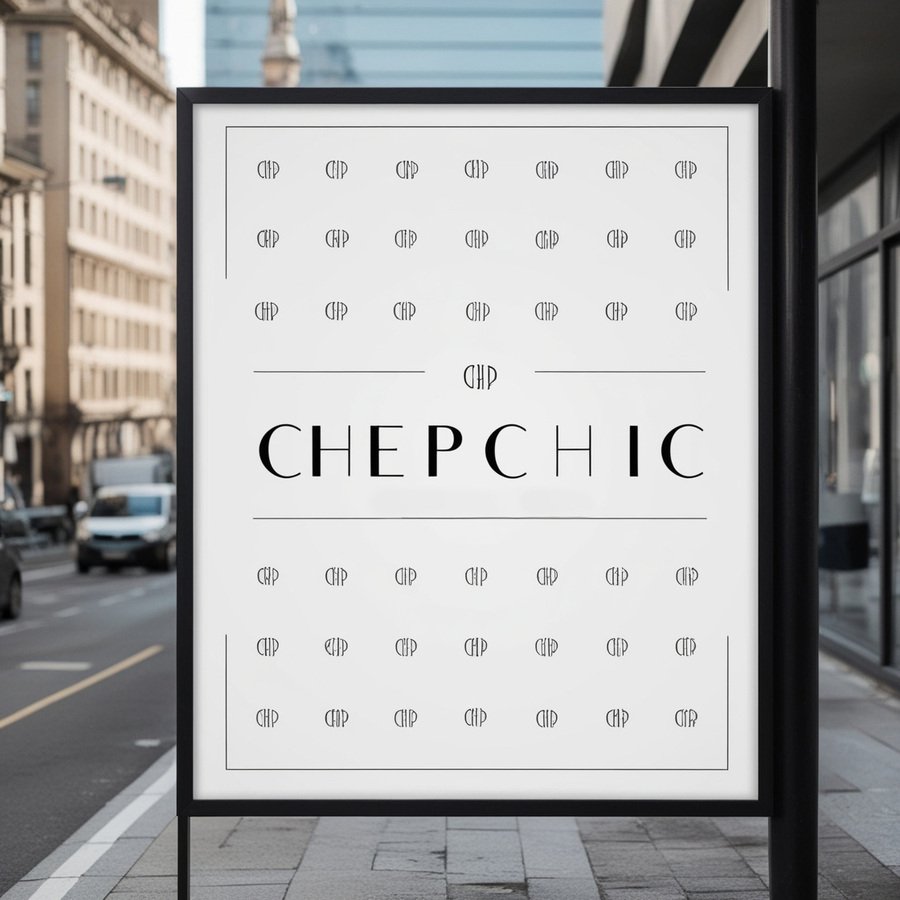 промт: create an advertising poster with monograms and thin lines in an urban environment for the brand Chepchic with a vector minimalistic logo, the logo should only have a beautiful font with the name of the Chepchic brand, the font should have a minimum number of openwork and thin lines, without a large number of details, the font should be with serifs with beautiful graceful angles